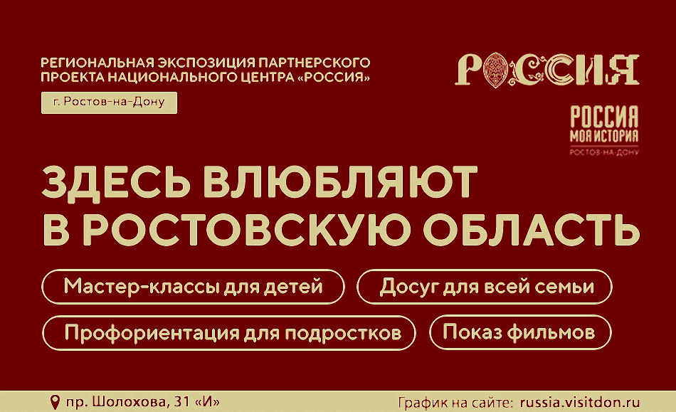 Приглашаем вас совместно с членами семей стать гостями экспозиции. С Pin-Up афишей предстоящих мероприятий можно ознакомиться по ссылке: https:/visitdon.ru/. Время работы экспозиции - выходные дни, с 10:00 до 16:00 часов.